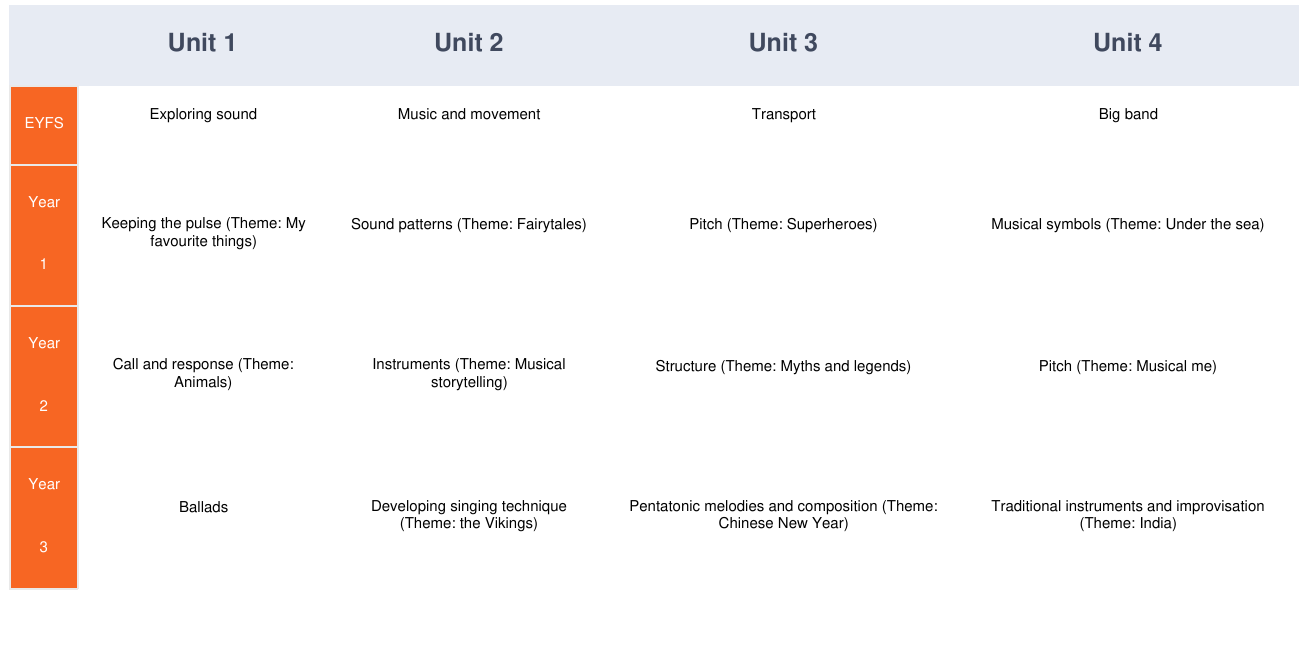 We use key CONCEPTS that are thread through our Music curriculum, from Yr R to Yr 6, in order to build on prior learning and support pupils making strong links in their knowledge, from previous learning.